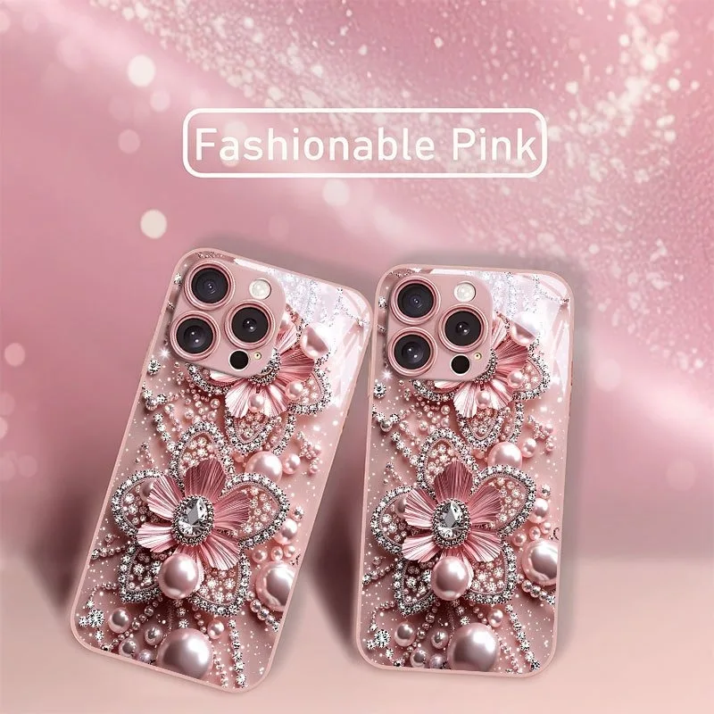 Coque de téléphone en verre métallisé rose à motif floral en diamant et perles roses pour iPhone 17 Pro Max, 11, 12, 13, 14, 15, 16 Plus, 17 Air et 16E